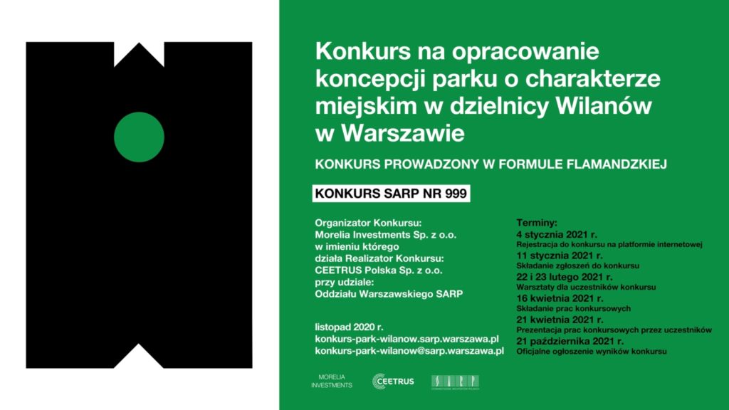 Morelia Investments Sp. z o.o. oraz Oddział Warszawski SARP ogłaszają konkurs nr 999 na opracowanie koncepcji parku o charakterze miejskim w dzielnicy Wilanów. Konkurs prowadzony jest w formule flamandzkiej.