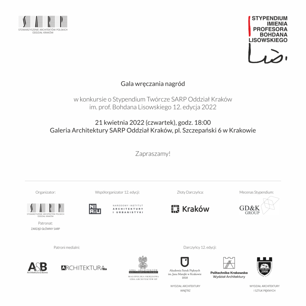 Ogłoszenie wyników i wręczenie nagród Laureatom XII edycji Stypendium Twórczego SARP Oddział Kraków im. Prof. Bohdana Lisowskiego