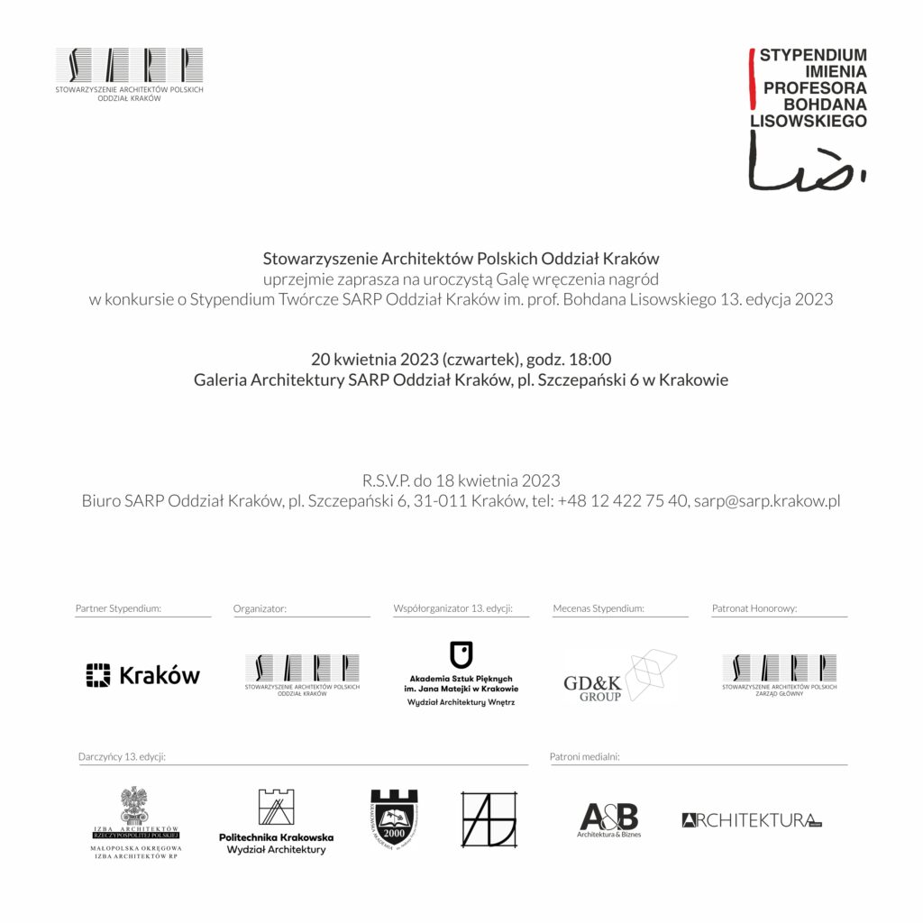 Serdecznie zapraszamy na Galę Stypendium Twórczego SARP Oddział Kraków im. prof. Bohdana Lisowskiego – czwartek, 20 kwietnia 2023 o godz.18.00.
