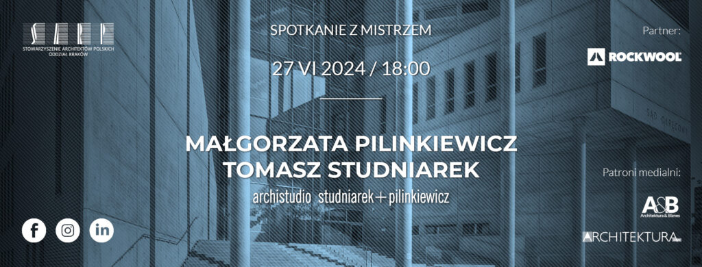 Stowarzyszenie Architektów Polskich Oddział Kraków serdecznie zaprasza w czwartek, 27 czerwca 2024 do Galerii Architektury SARP Oddział Kraków na wykład Małgorzaty Pilinkiewicz i Tomasza Studniarka z pracowni archistudio studniarek + Pilinkiewicz.