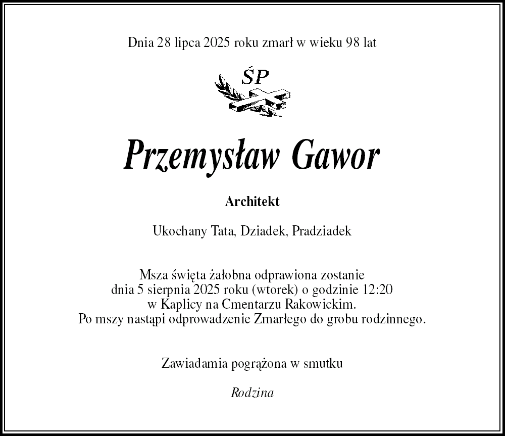 Pogrzeb odbędzie się we wtorek, 5 sierpnia 2025 o godzinie 12.20 na Cmentarzu Rakowickim w Krakowie.