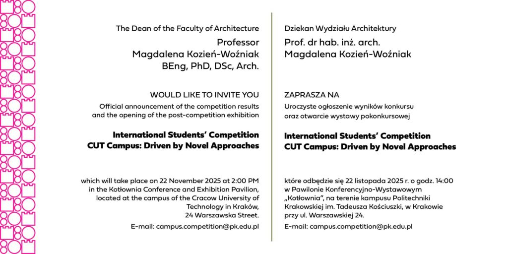 W imieniu Dziekan Wydziału Architektury, Prof. dr hab. inż. arch. Magdaleny Kozień-Woźniak zapraszamy na uroczyste ogłoszenie wyników konkursu oraz otwarcie wystawy pokonkursowej International Students’ Competition CUT Campus: Driven by Novel Approaches, które odbędzie się 22 listopada 2025 r. o godz. 14:00 w Pawilonie Konferencyjno-Wystawowym „Kotłownia”, na terenie kampusu Politechniki Krakowskiej im. Tadeusza Kościuszki, w Krakowie przy ul. Warszawskiej 24.
