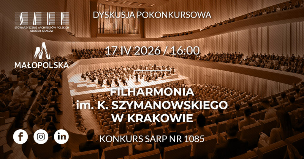 Województwo Małopolskie oraz Stowarzyszenie Architektów Polskich (SARP) Oddział Kraków zapraszają na dyskusję pokonkursową dotyczącą dwuetapowego, architektoniczno-urbanistycznego konkursu na opracowanie koncepcji nowej siedziby Filharmonii im. K. Szymanowskiego w Krakowie.