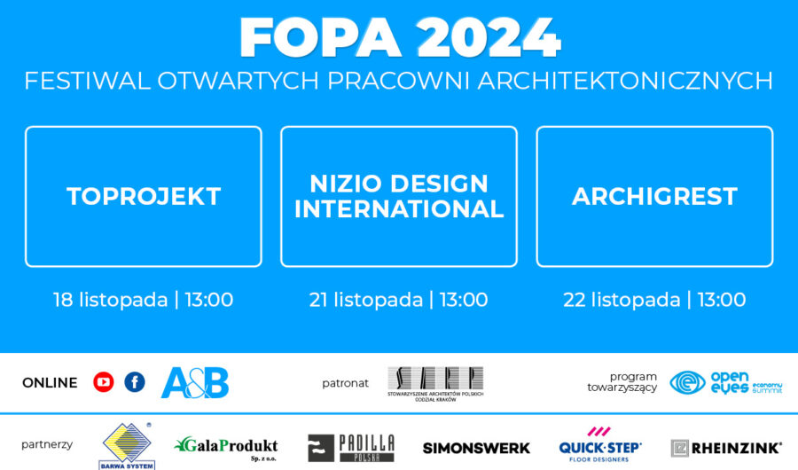Z przyjemnością informujemy, że 18.11.2024 rozpoczyna się kolejna edycja Festiwalu Otwartych Pracowni Architektonicznych FOPA, który jest wydarzeniem towarzyszącym Międzynarodowemu Kongresowi Ekonomii Wartości Open Eyes Economy. Festiwal skierowany jest do […]